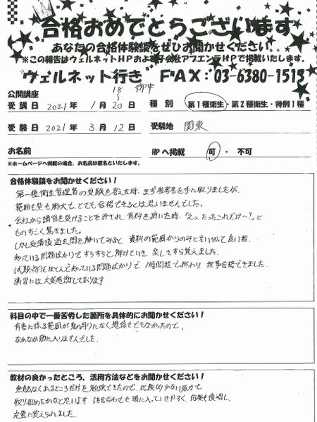 資格取得支援 衛生管理者受験対策講座 合格者の声 EメールやFAX等でいただいた合格報告から一部抜粋して、掲載しています。 無駄なく出るところだけを勉強できたので少ない労力で取組めた N様 2021年3月受験 関東 前ページ 戻る 後ページ
