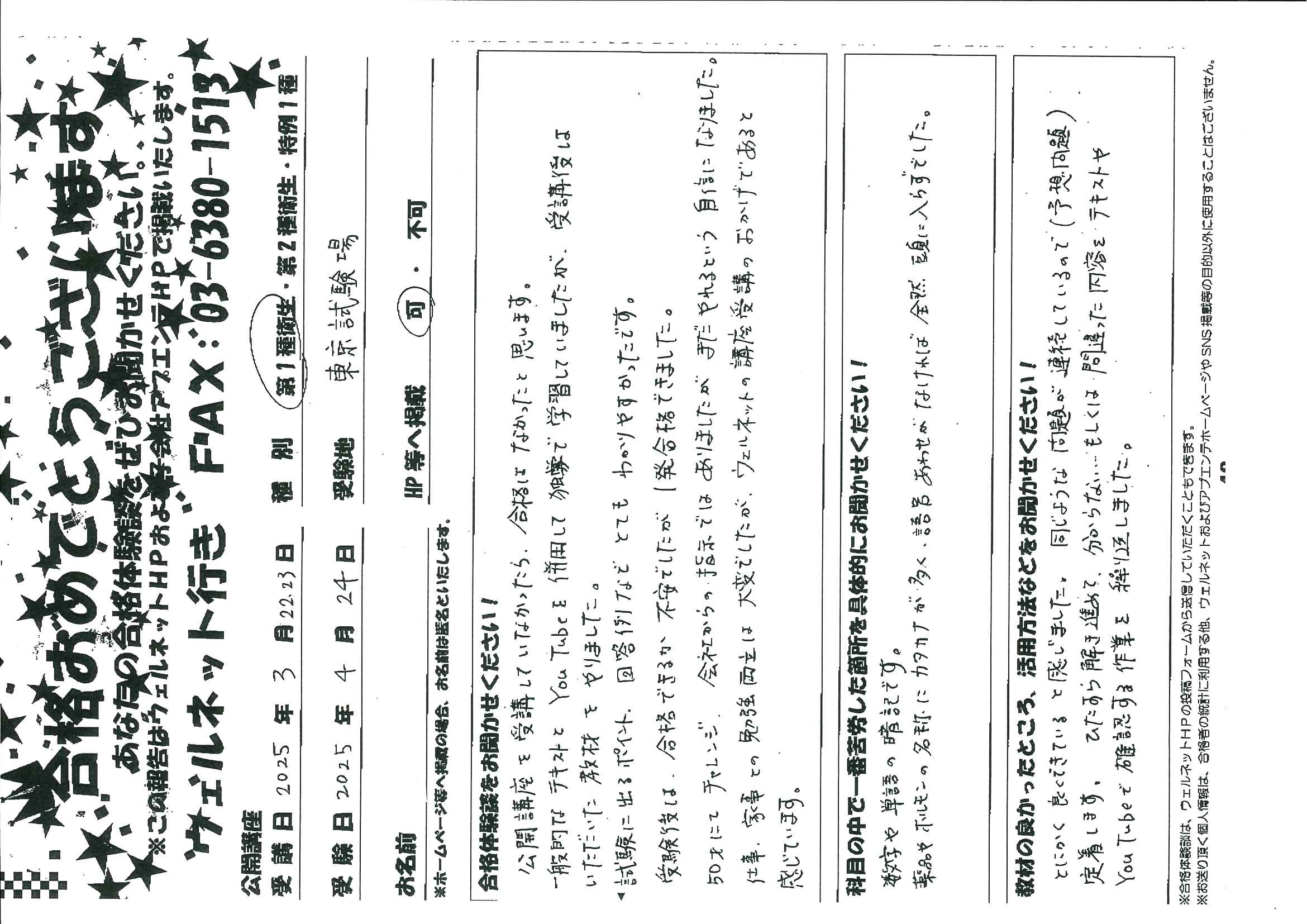 EメールやFAX等でいただいた合格報告から一部抜粋して、掲載しています。